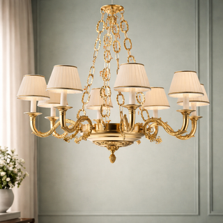 Elevate your space with our grand 12 Lights Chandelier, featuring an exquisite bronze structure adorned with graceful chains and elegant fabric lampshades. This chandelier seamlessly blends opulence with meticulous craftsmanship, casting a mesmerizing and luxurious glow throughout your setting. Illuminate your surroundings with grandeur and sophistication. Shop now to bring the enduring beauty of the 12 Lights Chandelier with bronze accents, chains, and fabric lampshades into your home.