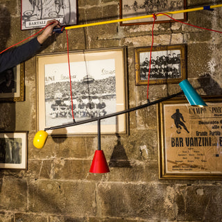 Questo lampadario è un mix di forme e colori, disegnato da Piero Angelo Orecchioni, è il ramo di un tree futuristico ideale tree frutti hanno forme e sapori diversi. Giocoso e allegro, è perfetto per illuminare la penisola di una cucina monocromatica o per valorizzare la geometria di un soggiorno.