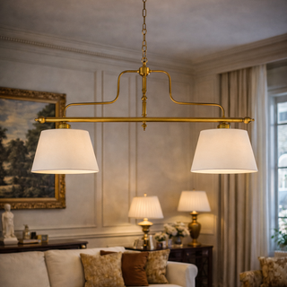 Migliora la tua sala giochi con timeless del lampadario a due luci Novecento Gambrinus. Caratterizzato da una struttura in ottone massiccio e raffinati paralumi in tessuto, questo lampadario unisce un design classico a un'illuminazione funzionale. Perfetto per illuminare tavoli da biliardo o spazi di intrattenimento, aggiunge un tocco di raffinatezza e calore alla tua casa.
