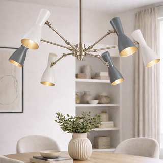 Lampadario a sei bracci dallo stile inconfondibile e dal carattere forte, dona un tocco di eccentricità all'ambiente. Gli snodi dei bracci consentono ampi e diversi movimenti, la doppia apertura dei sei paralumi diffonde la luce sia sopra che sotto, un vero pezzo d'arte contemporanea, un design unico e riconoscibile che caratterizza questo lampadario così come tutte le lampade della linea Wormhole.