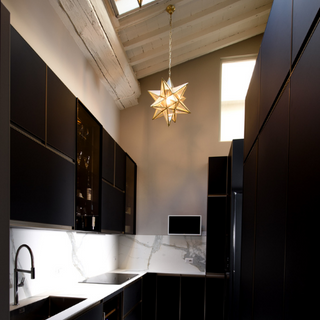 Il lampadario tridimensionale a forma di stella della linea Geometrie è realizzato in ottone e vetro ed è disponibile in diverse dimensioni, da extra small a double large. La stella rappresenta una delle forme più classiche proposte dai maestri artigiani del Bronzetto; infatti, nella tradizione fiorentina questa caratteristica forma era il simbolo della corporazione dei Giudici e Notai di Firenze durante il Medioevo, lampade e lampadari di questa manifattura si possono ancora trovare originali negli edifici storici del centro.