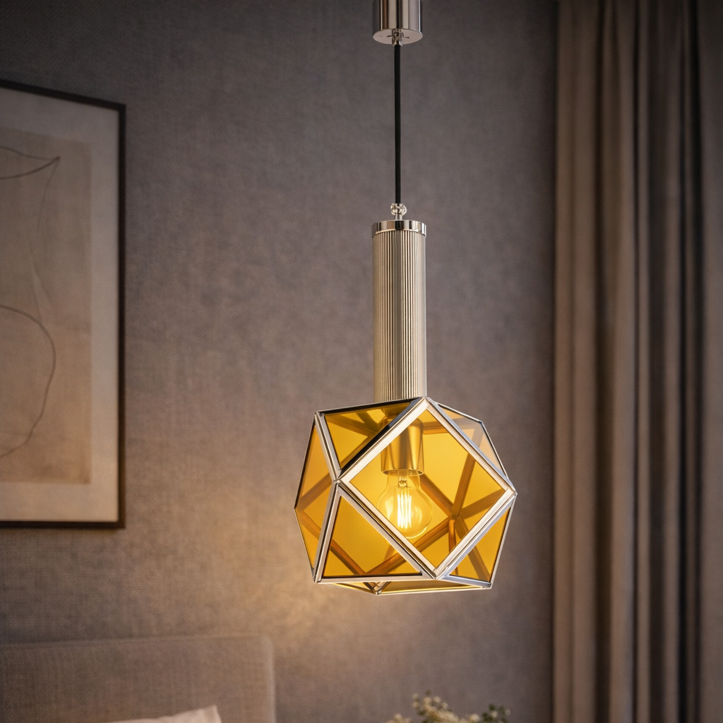 Suspensions with outdated shapes descend from the ceiling like the trapezoids of circus artists, the brass and colored glass shaped into triangles and hexagons create a multiform and altered reality, they shine and confuse as in a hall of mirrors. The new Amarcord line was designed together with Letizia Donati and Francesca Schäffer. A series of furnishing accessories in which geometric purity meets the savoir faire of Bronzetto: a dining table whose structure recalls that of the carousel with flying seats, a revolving coffee table made with the veneer of the Alpi company, which creates optical illusions in its twirling, and faceted lamps in glass and brass in balance between ancient and contemporary.