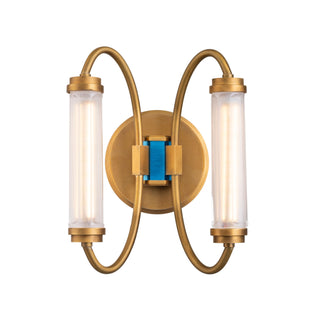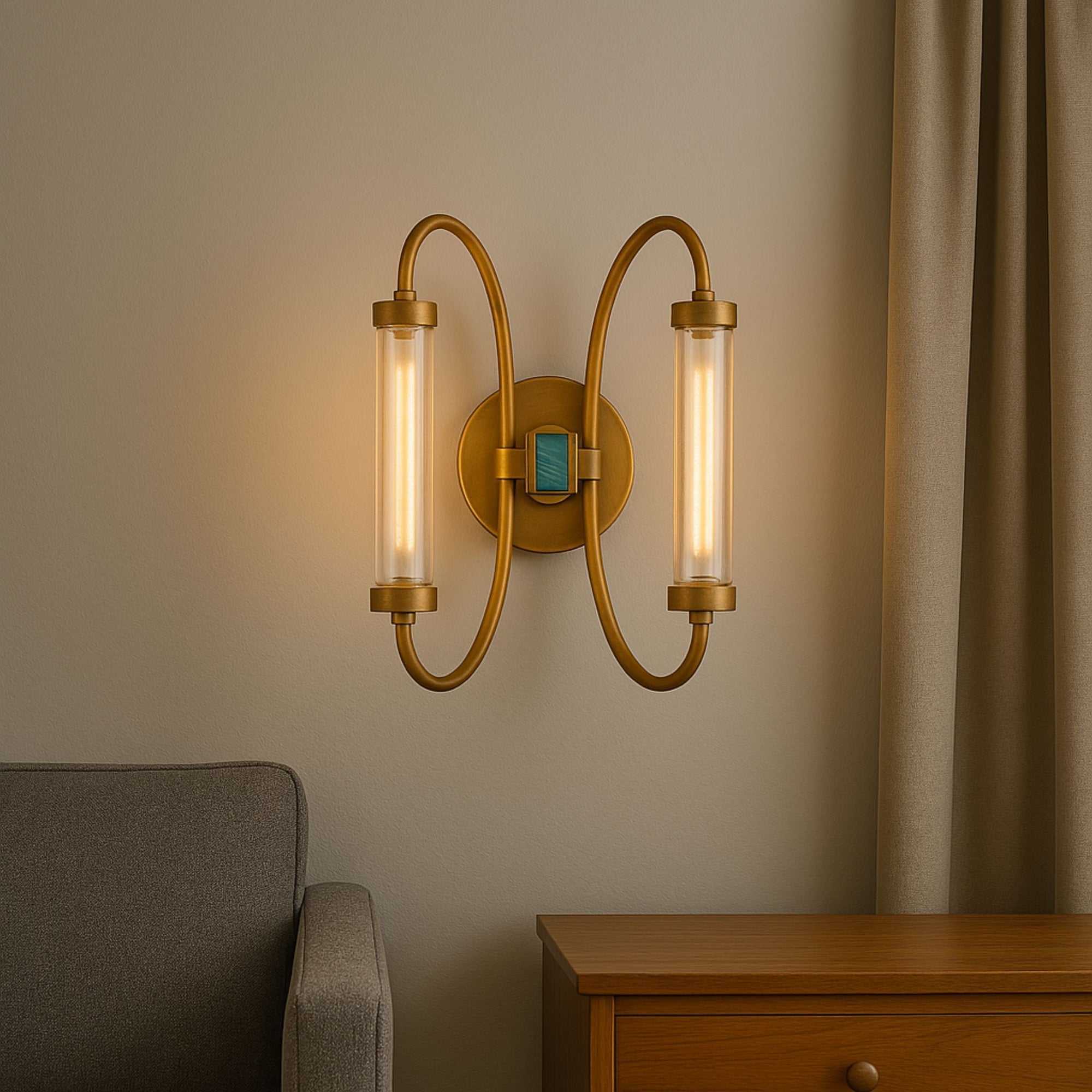 A decorative LED wall fixture with a curved brass arm emerging from a central circular mount.