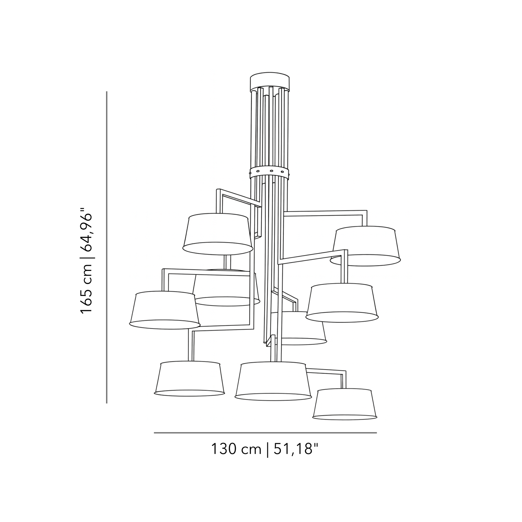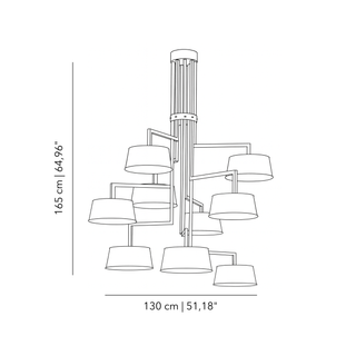 Ideal for spaces with high ceilings, it evokes a sense of theatrical rhythm and timeless grace. The brushed brass reflects light with warmth, while the dark lampshades filter it into a soft, poetic glow—never invasive, always enveloping.